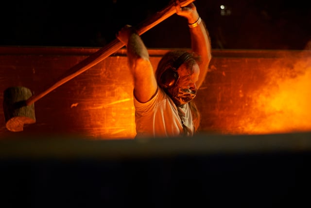 The piece included immersive sound pressure, sonorous dumpsters, battles and truces between robots and humans, and head-bobbing metallic rhythms,